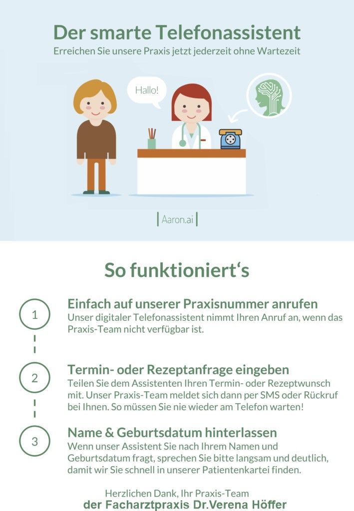 Das bedeutet konkret: Können unsere Mitarbeiterinnen persönlich keine Anrufe entgegennehmen, etwa weil sie mit der Patientenversorgung oder anderen Tätigkeiten des Praxisalltags ausgelastet sind, übernimmt eine smarte Sprachassistenz das Telefonat.